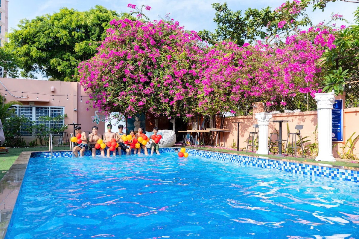 Villa khuôn viên 500m2, sân vườn rộng mênh mông, nhiều góc chill, tuyệt đẹp. Từ villa di chuyển ra quảng trường cột cờ bãi tắm Thuỳ Vân - khu vực đông vui nhất Vũng Tàu chỉ 700m, rất thuận tiện ăn uống vui chơi. Villa có sân vườn rộng, với nhiều tiểu cảnh và các loài hoa trái, rất phù hợp cho các gia đình nghỉ dưỡng. Đặc biện hồ bơi dài 18m rộng 60m2 có sub bơi, thuận tiện cho các bạn nhỏ chèo thuyền vui chơi