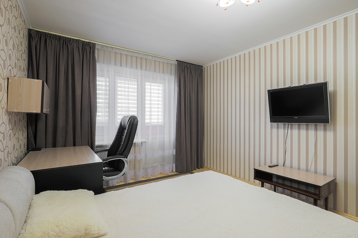 A studio apartment just 1 minute away from Minska Metro. Minimalistic, clean, cosy and stylish, the apartment features a working area, large sleep sofa (2m x 2m when unfolded) and a panoramic view from the 9th floor. It will take you about 15 minutes to get to the city centre by metro.