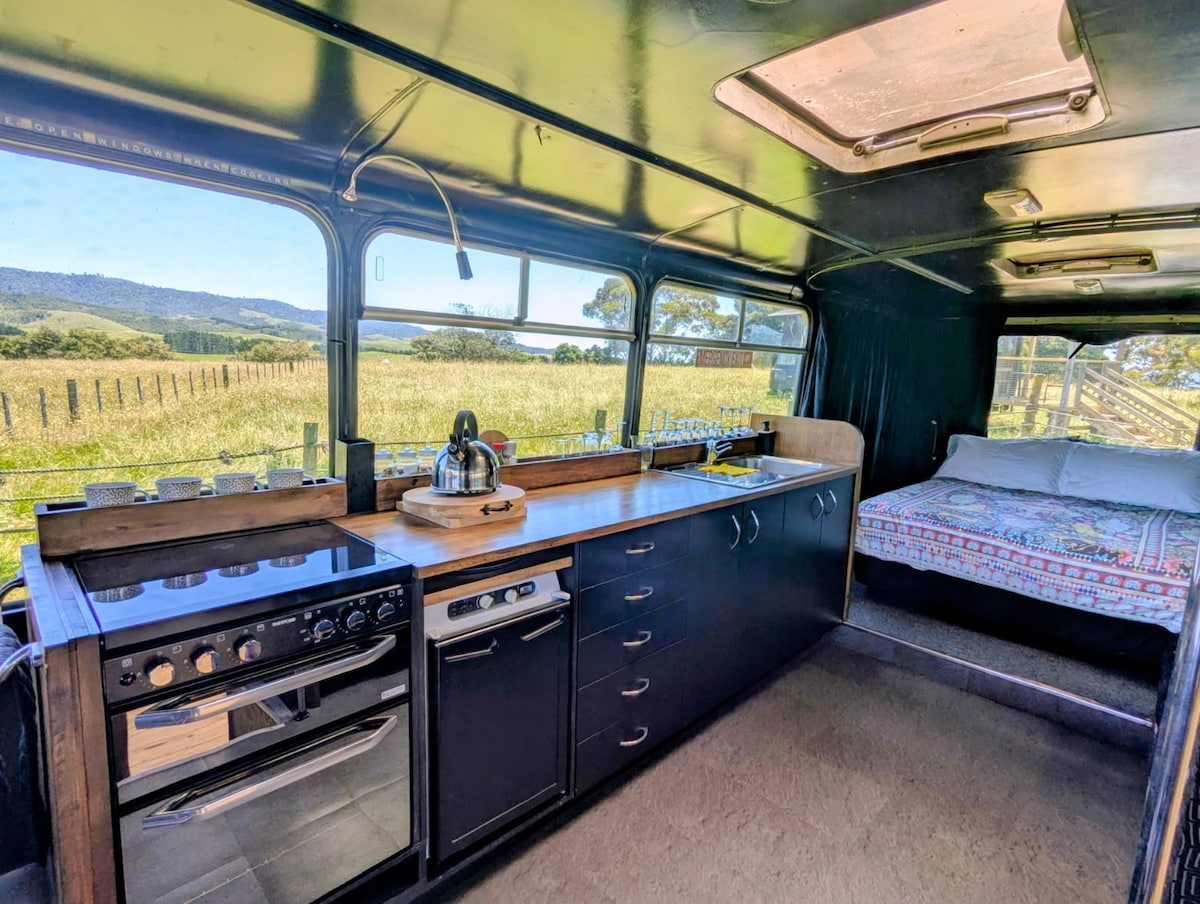 The Bus Depot is a rustic retreat overlooking the beautiful firth of Thames. A beautifully restored 1979 Bedford bus which has all the modern comforts but still retains original features of the bus, this area has sleeping for two along with kitchen area, fridge, gas stove and a dining area on the covered deck. From the daybed to the loft space or going for a walk on the farm or just sitting in front of the fire you can enjoy the views at this outstanding location.