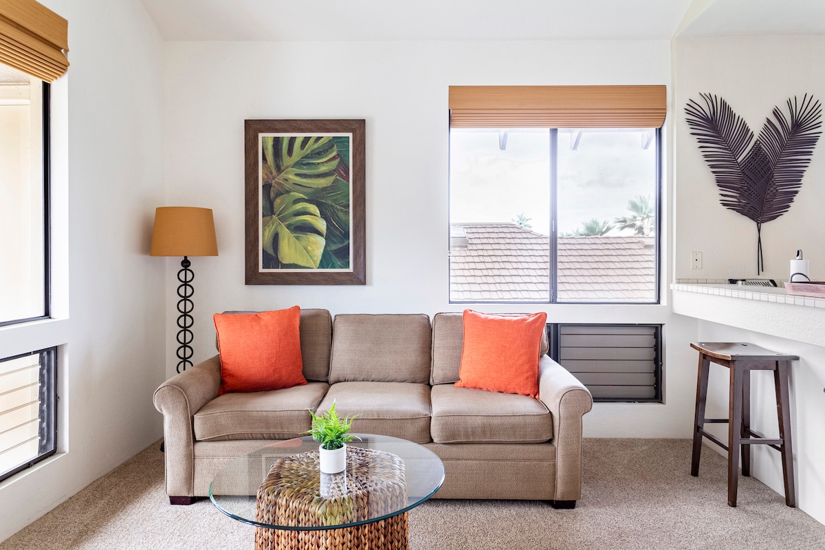 Ekahi says it all. Don't come all the way to Maui to stay in a bargain space. Unit 47A is a one bedroom (with sleeper sofa), two-bath renovated on the ground floor. This means a larger lanai than upper units. It also means that when you step off that lanai, you step onto A LOT of grass. Our condo is a 5-minute (barefoot) walk to the most wonderful of all Maui beaches; a ten-minute walk to the shops at Wailea. Restaurants nearby. Convenient yet without the road noise.2067153903 Privacy and peace.