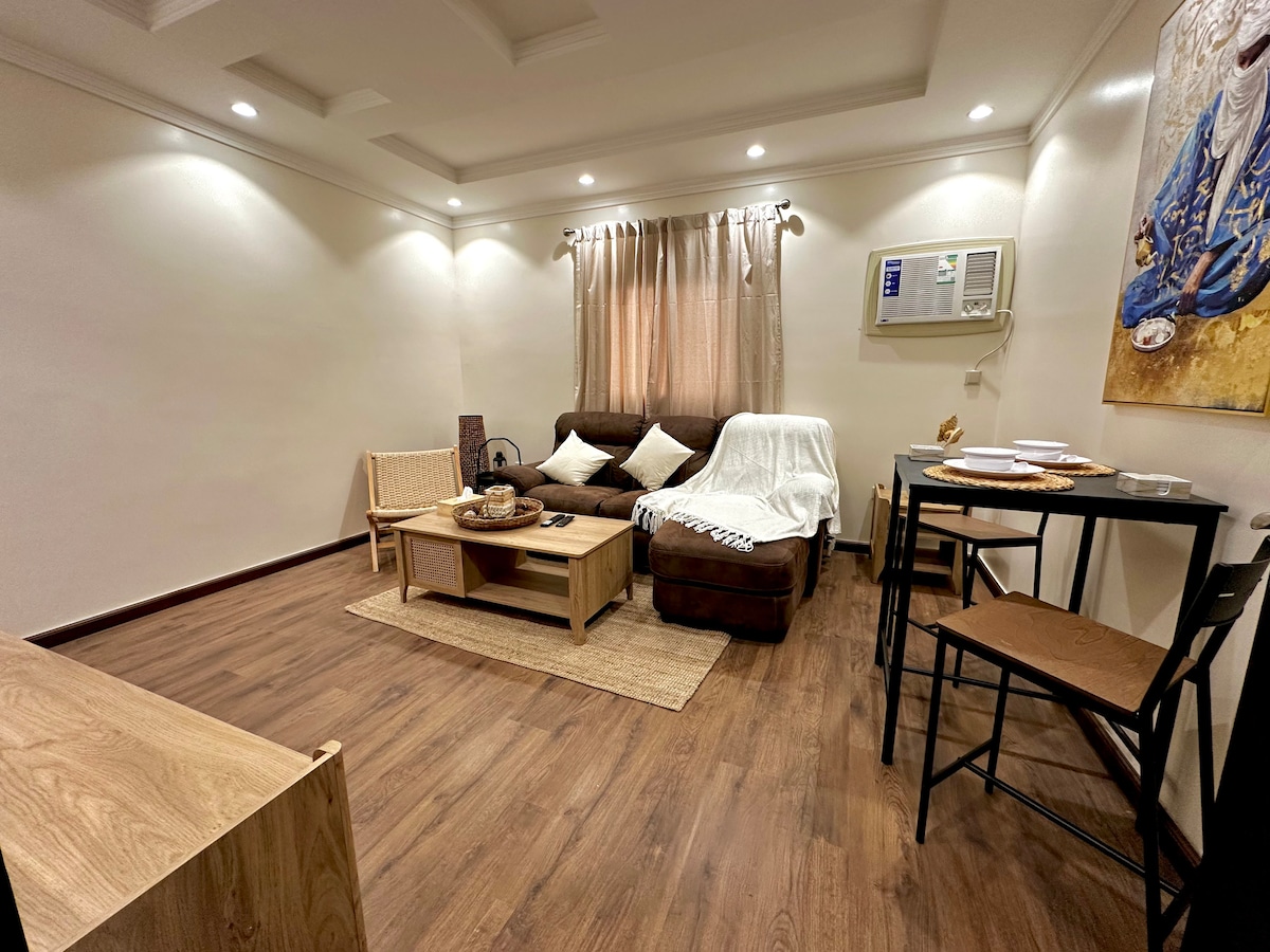 A spacious and quiet studio, with a large bed in the middle that gives a feeling of comfort, and next to it an elegant sitting area with a comfortable sofa and a simple side table. The place is practically and clearly coordinated, and its lighting is nice, giving it a warm and comfortable feel. 1.9 km from Kadi parking, the nearest bus station is 100 m away, 500 m from the Bataha Quraish walkway.