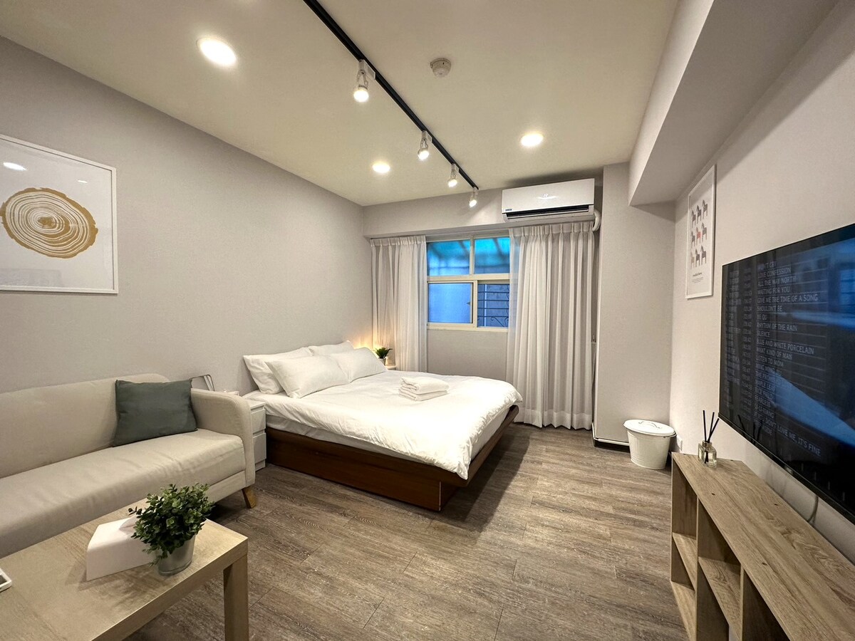 室內的灰白主色,配搭北美木紋銅色傢俱及家飾, 用心為您的居住空間提供沈靜優雅的感覺。日韓系電器的選用,不論是無線充電藍牙喇叭,大螢幕伸縮高清電視,都能滿足您對影音效果的要求。房源位於高樓內縮樓層,阻絕不必要的噪音並滿足您對景觀,安靜及隱私的要求。大樓並配有全天候警衛,住戶專屬電梯,公用大露台,以及地下收費停車場, 位處西門町核心路段,無論搭乘捷運或自駕都非常方便。Earth tone- based interior design offers warming, calm, healing and delighted atmosphere. Room facilities, including double bed, en- suite bathroom with shower enclosure, air conditioning, smart 4K TV with movies/Netflix, WIFI internet, cove lighting and music player with wireless connection & USB charger ports.