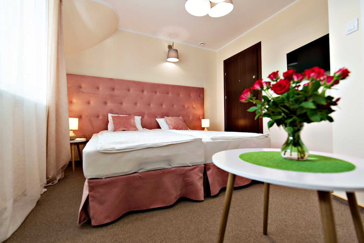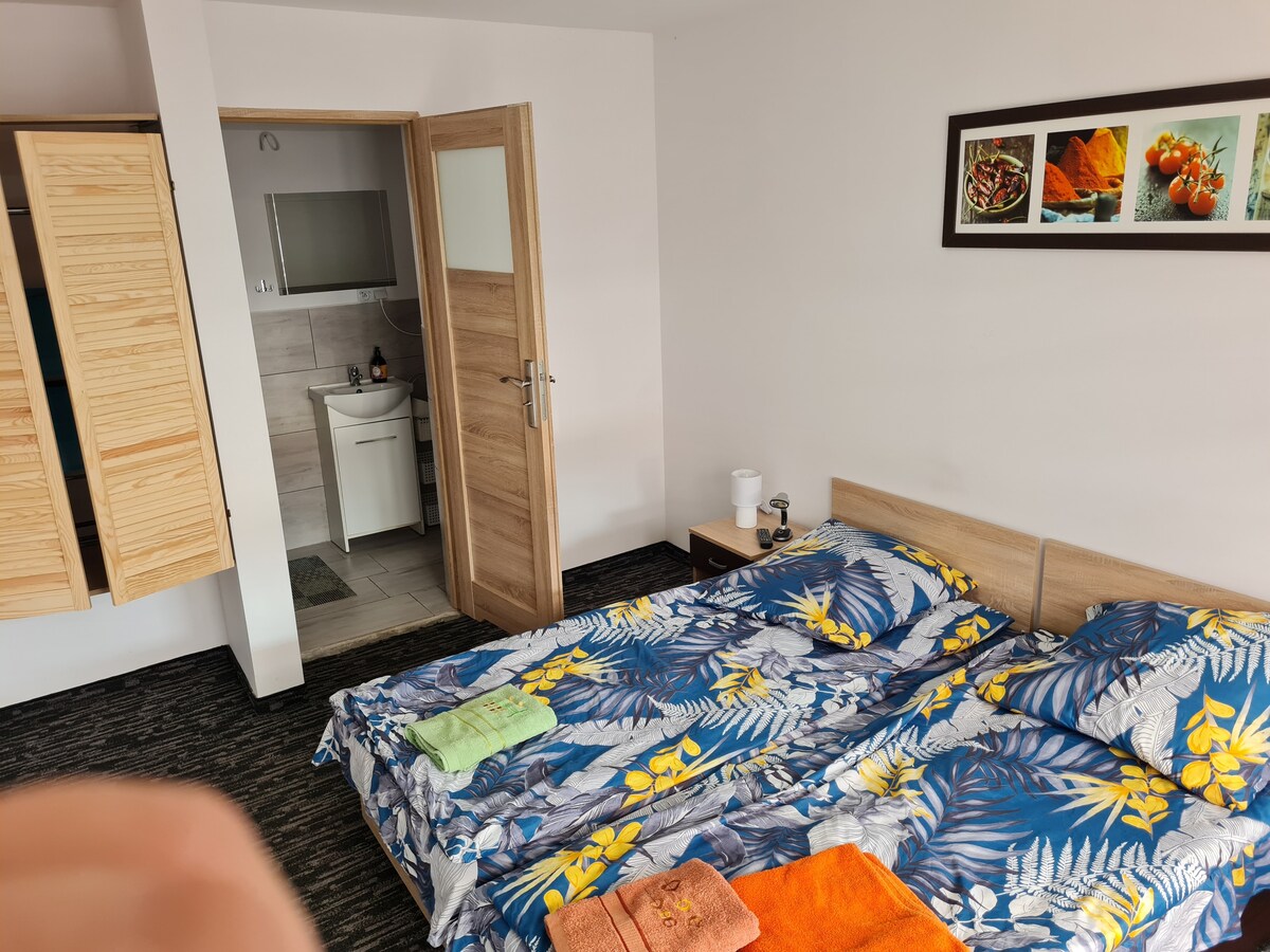 Double room - 15m2, located on the ground floor. The room has two single beds that can be combined into one double bed. Bathroom with shower, set of towels changed on request, hairdryer, fridge, kettle and tea and coffee set. The windows have mosquito nets and blackout blinds.