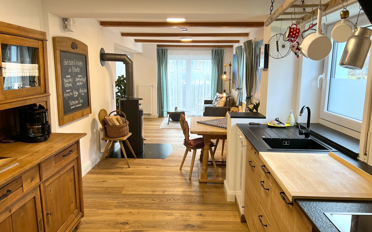 A lovely, country-style apartment with many historical elements in a refurbished farmhouse. We spent four years, till 2017, lovingly restoring our home and the adjacent apartment, using only the best ecological materials. (eg. wood-fiber insulation, as well as clay plaster on all the inside walls.) Achtung: Für größere Gruppen ab 8 Personen steht ein weiteres Apartment nebenan (100qm) mit weiterem Schlafzimmer, 2x2m Doppelbett, Küche und Bad zur Verfügung.