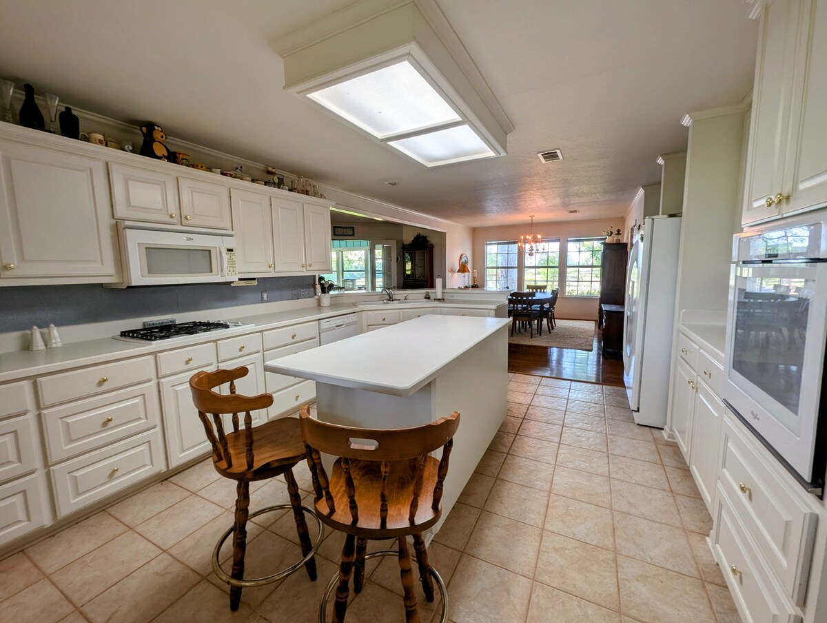 Relax with the whole family at this peaceful ranch house on 50 beautiful acres. Enjoy your morning coffee on the back patio with a serene view of our longhorn roaming the grounds. For a unique experience, climb Longhorn Lookout and enjoy an unobstructed aerial view of the property. With a quaint winery just 7 minutes down the road, you’ll have no problem filling your time away from home! Check out Splashway Water Park for more fun family adventures during your stay.