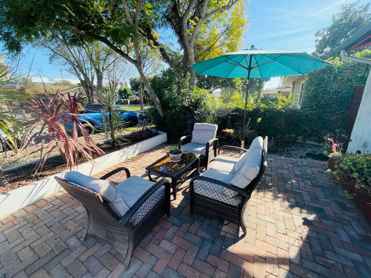 Keep it simple at this peaceful and centrally-located place. Studio is a duplex property with all amenities for your comfort. Water softener, filtered water, and instant hot water for tea. Air fryer, coffee maker, washer dryer. Enjoy the soaking tub and relax with candles, lighted mirrors, defogger and blue tooth speaker. Large closet. Short ride to beaches and all LA attractions are 30/45 minutes. Walk to cafes and parks. Sit in your private courtyard around the fire and/or dine outside.