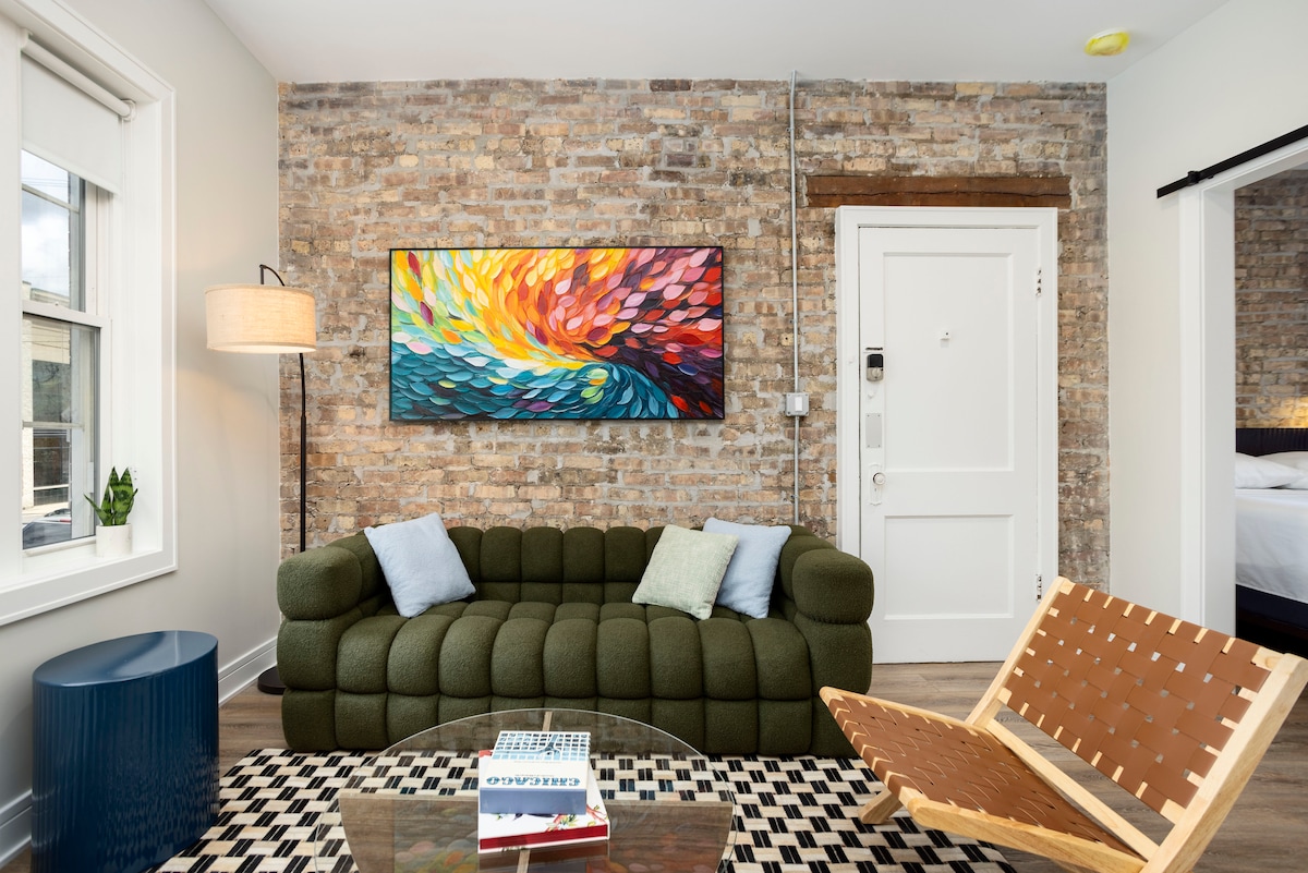 Step into The Artistic Brick Loft, featuring modern amenities and artistic flair. The bedroom includes ample storage and unique décor. The living area boasts an exposed brick wall, chic furniture, and captivating artwork. The kitchen offers modern appliances and a dining area. The bathroom features a sleek design with a walk-in shower. In-unit laundry and easy street parking compared to other city locations ensure a hassle-free stay. Enjoy comfort and style.