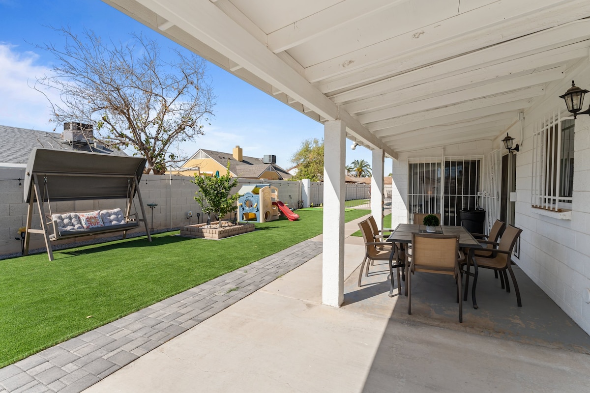 Clean Spacious House. 5 mins away from StateFarm Stadium. 3 bd/2 ba; 1 king, 2 queen, 1 sofa bed, 1 qu & 3 single air mattresses, Living & family rm w/ full kitchen. Washer/Dryer, Linens/towels/iron. Shampoo/Conditioner/ body wash/ razors/hair dryer & curling iron Netflix &HBO Max Full Pantry w/Coffee & Tea/cookie bar Basketball court, Corn Hole, Out door fire pit 4+ car parking space Only service animals. Self check-in, alarm system 1/2 refund if cancelled 48 hours prior to checkin