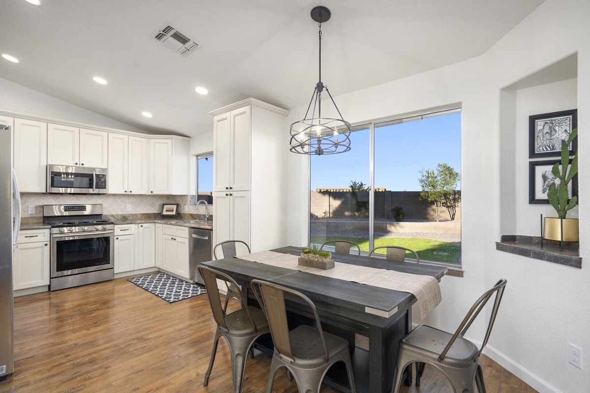 Family friendly Entertaining Home; Large covered patio with plenty of seating, fire table, Treager grill, 10ft private heated pool Oct-May (included). Fully stocked chefs kitchen- double ovens, gas cooktop. Comfy beds, smart TVs in all bdrm’s . Baby/kid items. A perfect location for your Arizona getaway. Only 0.8 miles from the State Farm Stadium, Desert Diamond, Westgate, restaurants and adventures avoid traffic walk to your event! Weekly/Monthly discounts. Essentials for your stay provided.