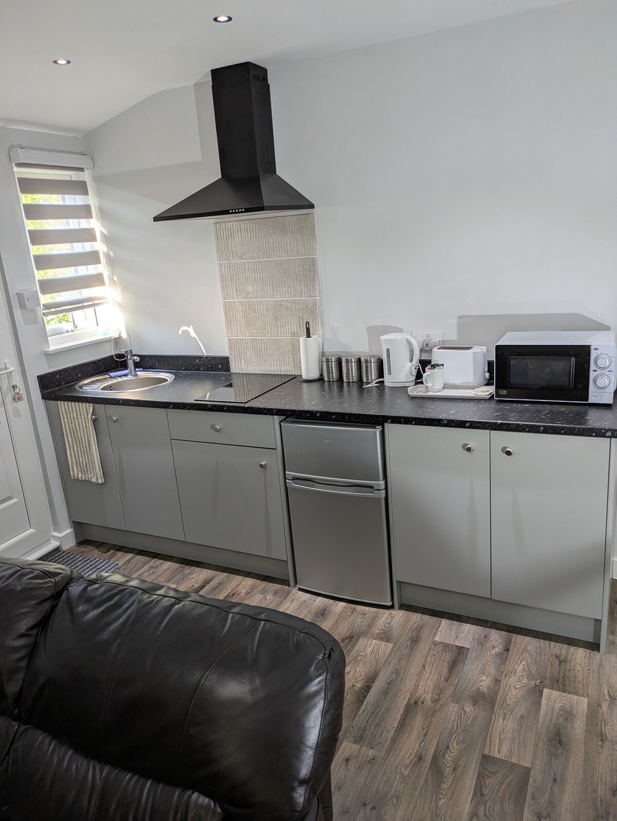 A lovely indendant apartment at the bottom of our garden secluded by trees . the apartment has a nice outside area with patio table and chairs . Inside there is a large open plan kitchen , dinner, lounge with a sofa bed and a well equipped kitchen with double oven , fridge freezer , dishwhaser , whashing machine microwave , toaster, kettle and much more . theres a large smart tv and wifi , dinning table . bedroom with king size bed and built-in wardrobe . bathroom with walk-in shower .