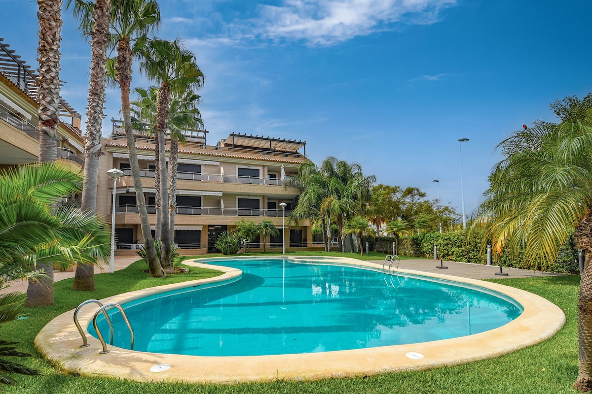 Charming apartment, located in a Private Urbanization. Tourist L. VT441979A Perfect for working, 1 Gb Wifi and to enjoy. Ground floor with porch, independent entrance, direct access to the garden and swimming pools. Contactless key delivery at any time. At 200 m. from Les Marines Beach. At 600 m. from Les Bovetes Beach. 3.5 km from the Urban Center. BUS stop 50 m away. Strict cleaning standards. Ideal for 2 adults and 1 child. Ideal for work. 500M fiber and work table.