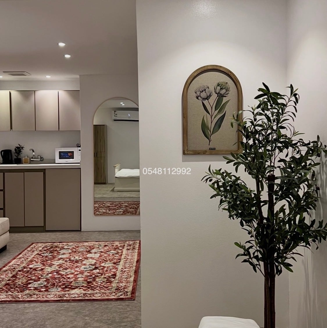 تقع في منتصف الهيئة الملكية قريبه من المطاعم . صُممت بألوان مريحة مؤثثة بأثاث جميل . يوجد واي فاي . يوجد شاشة . تتميز بدخول ذكي . أتمنى لك إقامة سعيدة و حياك الله .