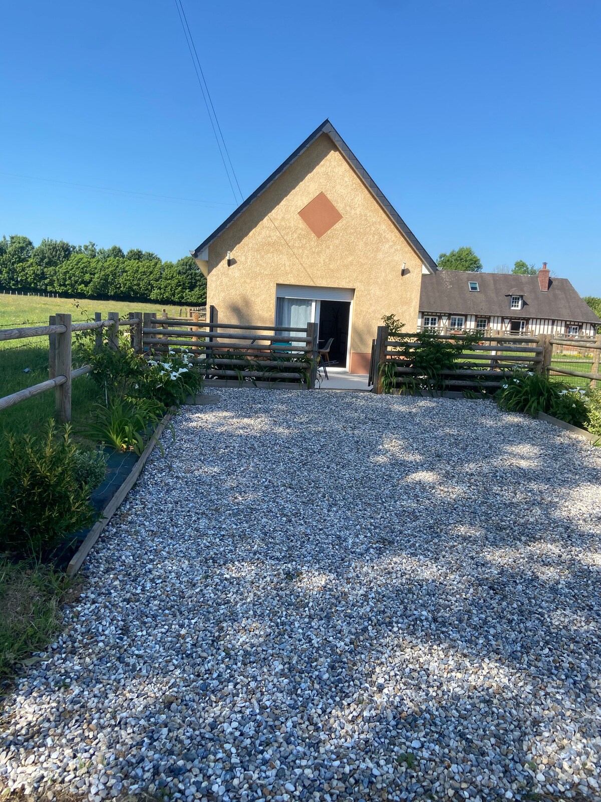 5 km from an exit on the A 29, "Les Mésanges" is a real half-timbered Norman house, recovered from a barn from the beginning of the last century. This vast house is in the heart of a wooded park where horses come to graze in the summer The cottage has a large 36 m2 private space with: a 16 m2 bedroom, a 9 m2 bathroom (walk-in shower), a separate toilet, a small equipped kitchen with dining area overlooking an entrance with direct access to your south-facing terrace.