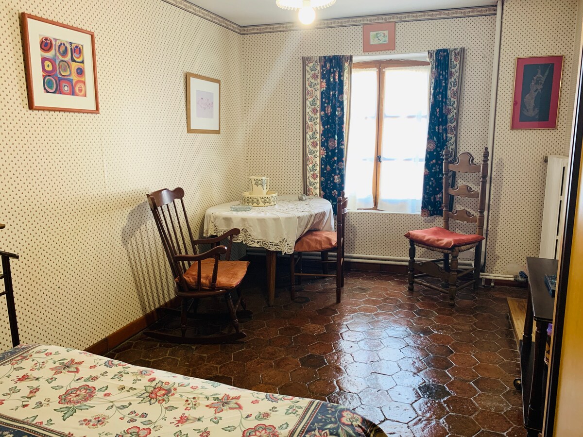 La maison donne sur un jardin avec une grande terrasse où vous pourrez vous reposer ,la fenêtre de la chambre donne sur le jardin . grande chambre de 35 m2,salle de bains avec baignoire retro,un wc. L'entrée est indépendante,avec serrure .La chambre est située au premier étage ,acces par un escalier en pierre. Pour les voyageurs le désirant,possibilité de dîner pour 25 euros tout compris.A préciser lors de la réservation. Petit dejeuner offert. lave linge +seche linge 5 euros pour le GPS :wase