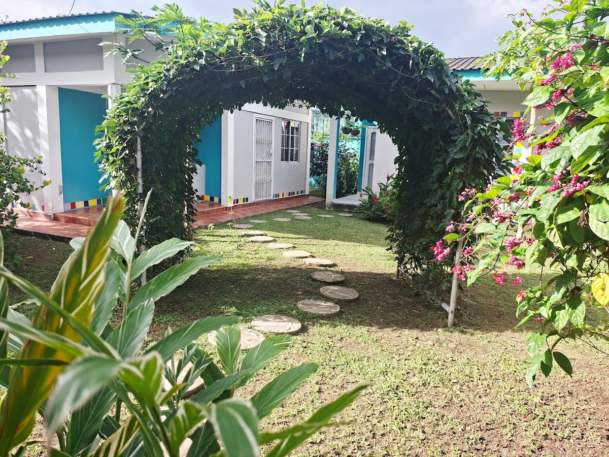 Nestled away in the lush jungle of the Rio Cangrejral with gorgeous mountain views on 1.7acres of beautiful gardens, our house has a 1 bedroom apartment downstairs and a studio upstairs, both places have hot and cold water, fully equipped kitchen, very private and safe location within in 5 minutes walking distance to Omega Lodge and Adventure Tours, with bar, restaurant, wifi, and all sorts of outdoor-adventures, please book ahead.