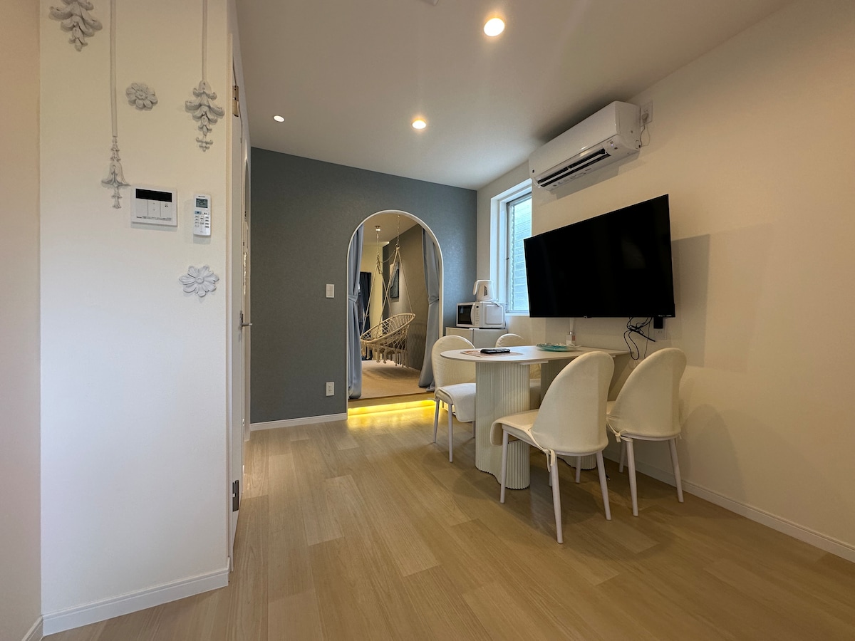 Hidden in the ancient capital · Between the mountains and the sea · Kamakura leisure residence Highlights Private courtyard The building has a two-story structure with four separate rooms on the first floor, each with its own small courtyard surrounded by greenery. Whether it's a conversation under the stars at night or a coffee in the morning, it's all about the atmosphere. Newly decorated with Mediterranean white and lake blue tones, rattan hanging chairs and arched window arches create a light and cozy atmosphere. Soft sofas, warm sunshine, gently swaying hanging chairs, every detail is like a movie scene in life. Exploration Guide Komachidori Shopping Street (10 mins walk) Kamakura's most popular shopping and food street, featuring delicacies such as fruit, curry bread, matcha ice cream, and more, as well as metal carvings, owl interactions, Shiba Inu cafes, Miyazaki Hayao themed shops, and more. Tsurugaoka Hachimangu Shrine (15 min walk) Kamakura landmark shrine, a symbol of samurai culture. A fusion of culture and nature, it is a great place to take photos and pray. Yuigahama Beach (about 15 minutes on foot, 5 minutes by bike) White sand like silver, waves crashing ashore. It's a great place for a morning walk or a morning run, and a great place to watch the sunset in the evening. CIAL Kamakura & Convenient Living Circle CIAL Mall (inside Kamakura Station): dining, supermarket, bookstore, souvenirs 7-Eleven & FamilyMart: Convenience stores within 3 minutes' walk Tokyu Store Supermarket: Convenient for daily purchases Service Description Luggage storage available Free Wi-Fi is available throughout the building Self check-in, flexible and convenient