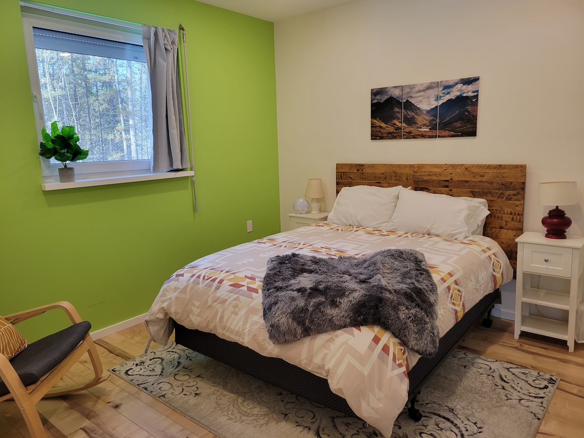 Welcome to Little Bear Nook~ This 1 bedroom, 1 bathroom lower level suite is in a lovely, family-friendly neighbourhood 10 minutes from downtown Whitehorse. This suite has natural bright light for those winter dark days. We're located right next to "the ridge"- a beautiful walking trail amongst the forest. It has a brand new queen bed, with new linens, a new couch that converts into a bed and a fully stocked kitchen. Enjoy unlimited internet & a TV.