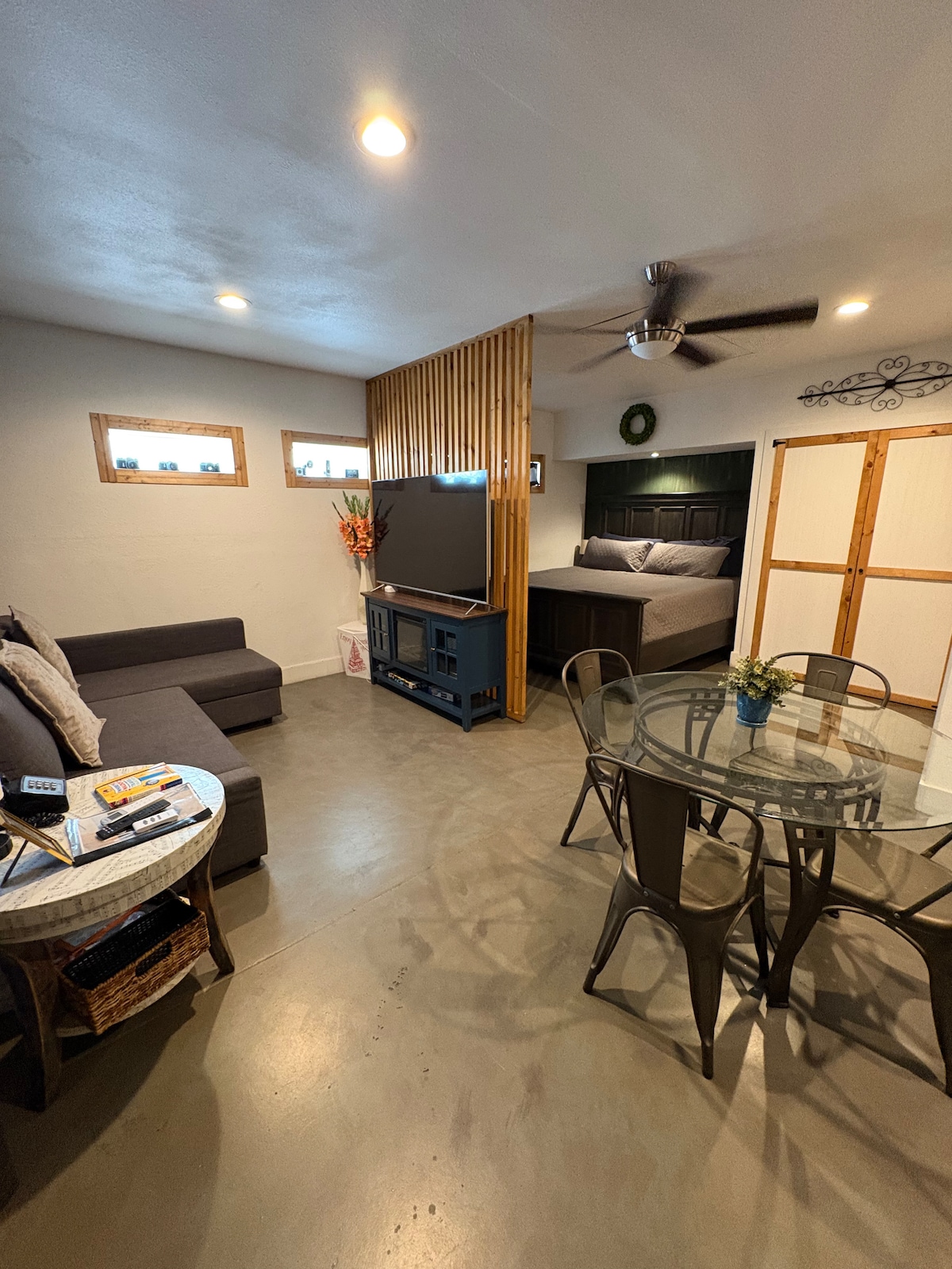 Enjoy a stylish experience at this centrally located guest studio. The studio is less then 5 min away from the hospital, stores, fast food, Gas stations and Starbucks. This is a fully converted garage,remodeled the buildings has its own patio and gated entrance, 1 purple king mattress , 1 bathroom, sleeper sectional, fully stocked kitchen, television with live tv and roku Guest access Studio entrance on the side of the residence, driveway parking, Keyless entry, self check-in.