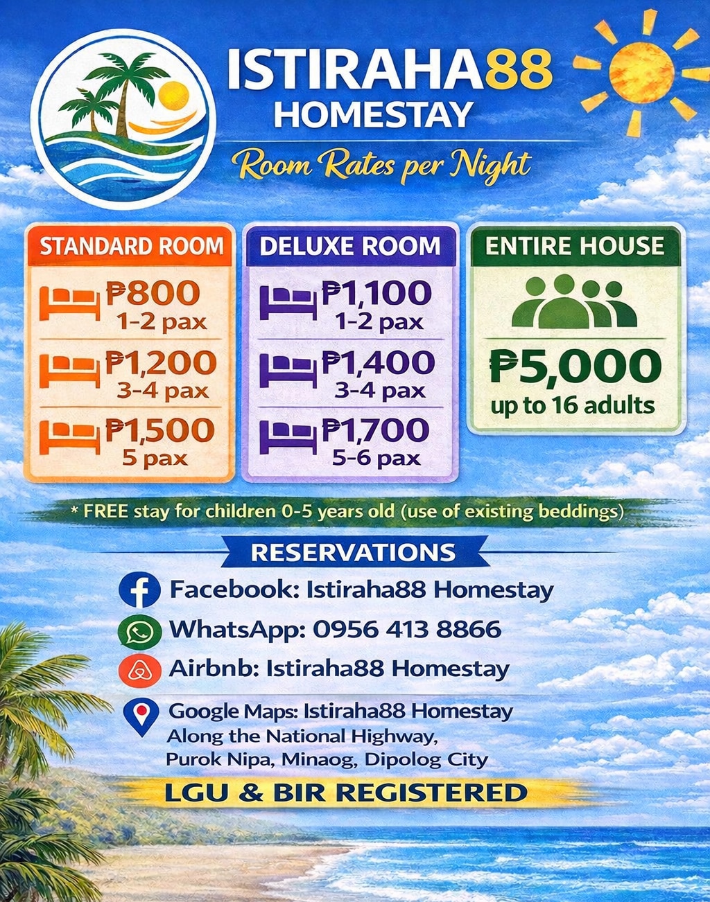 🌴 Cozy & Convenient Stay in Dipolog 🌴 Relax at Istiraha88 Homestay, your comfortable home along the National Highway in Minaog, Dipolog City. Enjoy air-conditioned rooms, fast WiFi, a fully equipped kitchen, and a peaceful atmosphere perfect for families or groups. With easy access to nearby attractions and essentials, it’s the ideal place for both short and long stays. 5th guest add-on fee