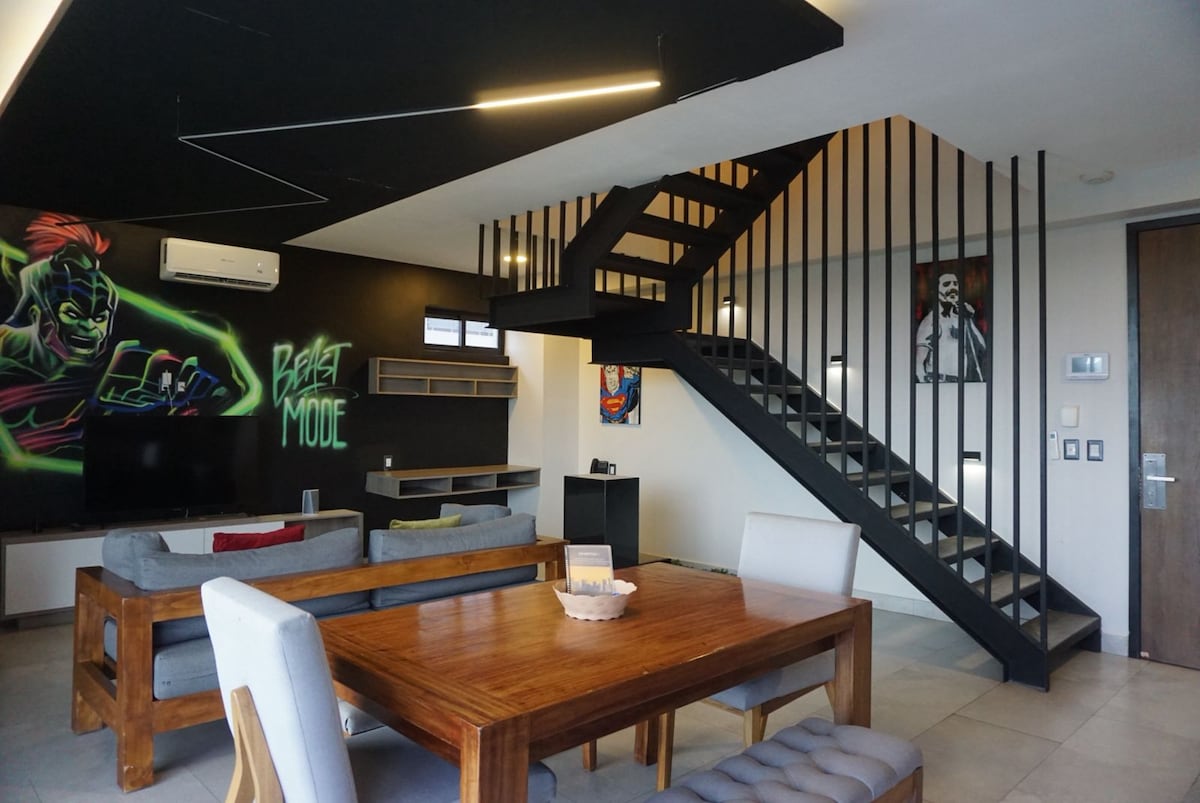 Lujoso departamento único en su clase, con el propósito de redefinir el interiorismo en Airbnb. Hemos puesto atención en cada detalle para lograr una experiencia diferente y única. "BlacknWhite" es un departamento con acabados y amenidades de lujo. A pocos minutos de Plaza Andares, tiendas de ropa y restaurantes. *CUALQUIER VISITA DEBE ESTAR INCLUIDA EN LA RESERVACIÓN* (Hasta 7 personas)
