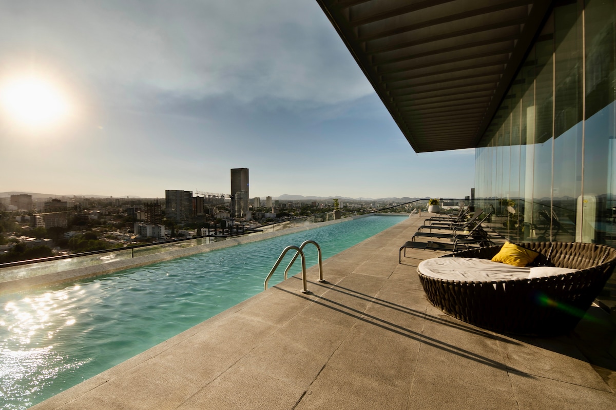 Stay in the most exclusive area of Guadalajara with a spectacular view on the 20th floor Located one block from ANDARES and LANDMARK, surrounded by all services, HOSPITALS, RESTAURANTS, SHOPPING CENTER, SUPERMARKET, CLUBS. We give you access to the incredible pool with an endless view of the city from the 9th floor and the jacuzzi However, due to Tower policies, you will NOT be able to use the gym or any other common area, except the pool and jacuzzi that you will undoubtedly love.