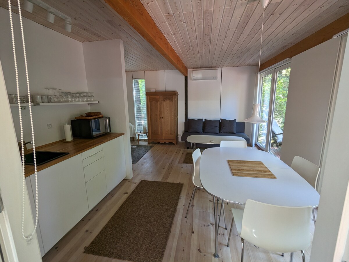 New cottage in the absolute 1st row and private beach at Musholmbugten and only 1 hour from Copenhagen. The house is 50 m2 and with a 10 m2 annex. The house has an entrance hall, bathroom/toilet with sauna, bedroom and a large kitchen/living room with alcoves. From the living room there is access to a nice large loft. The house has air conditioning and a wood-burning stove. Annex contains room with double bed. House and annex are connected by wooden terrace and there is outdoor shower with hot water. Bedroom in the house as well as loft and alcove.