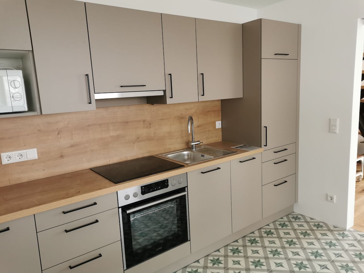 Apartment (attention: without a kitchen) with separate entrance in a tranquil, quiet village You have your own bathroom and a separate toilet, can share the garden and its seating and there is also the possibility to book breakfast. In the room you will find a coffee maker, fridge, small selection of dishes for all occasions and a mini oven. The dining area with two chairs can also be used as a workplace.