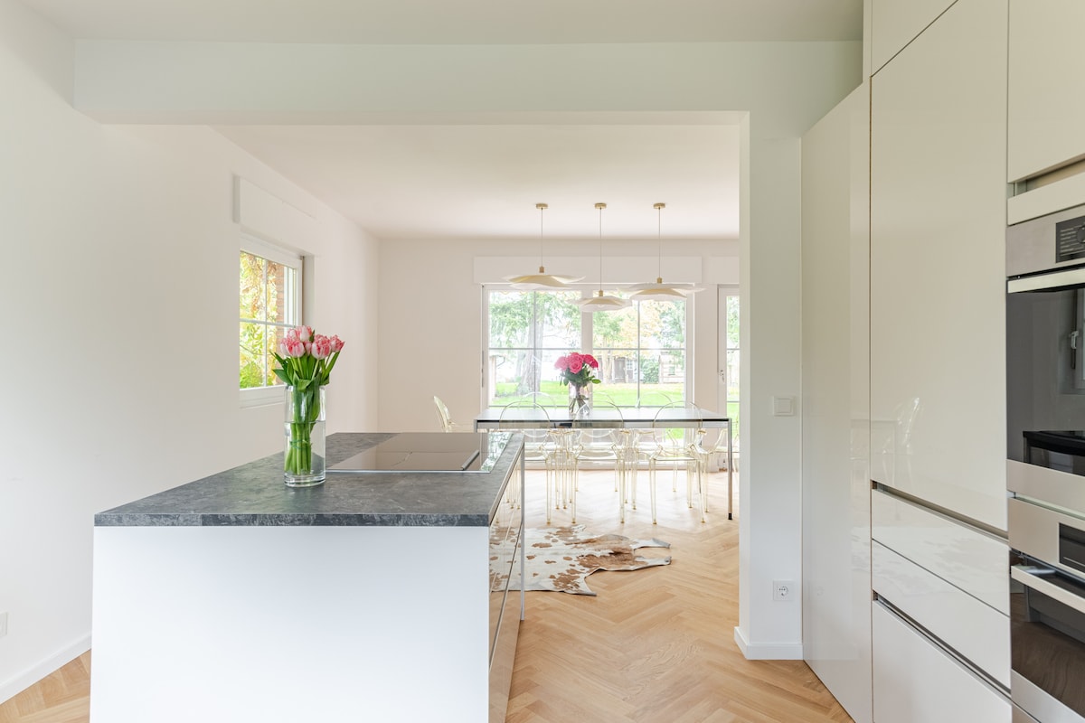 Welcome to this unique carriage house (90sqm). Built in 1922, it has been carefully restored and converted with high-quality materials. This romantic remise is located on Potsdam villa premises featuring old fruit and walnut trees, directly at the shore of Jungfernsee. In the summer, you can enjoy a swim in the lake before breakfast, if you wish. Only a stone’s throw away from the world-famous Glienicke Bridge. For decades during the Cold War, the bridge was the place where spies were exchanged.
