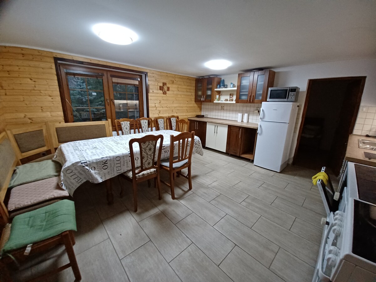 Chata v krásnom prostredí.Na prízemí sa nachádza obyvačka spojená s kuchynou a kúpeľňa (WC so sprchovym kútom).Z obyvačky sa dá vyjst na terasu.Na poschodí sú 3 spálne (2, 3, 4-lôžková).Na poschodí sa nachádza aj kúpeľňa s WC a vaňou.Gauč v obývačke je rozkladací.V kuchyni je všetko potrebné vybavenie (poháre, príbory, taniere, hrnce, panvice...),mikrovlnka, sporák,chladnička.Potraviny sa tam nenachádzajú žiadne,ani tam prosím žiadne nenechávajte.K chate patrí altanok a v suterene spol.miestnosť