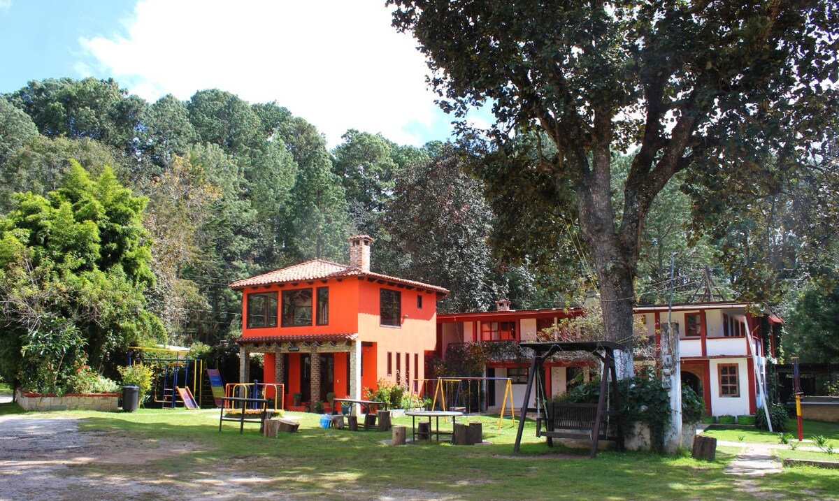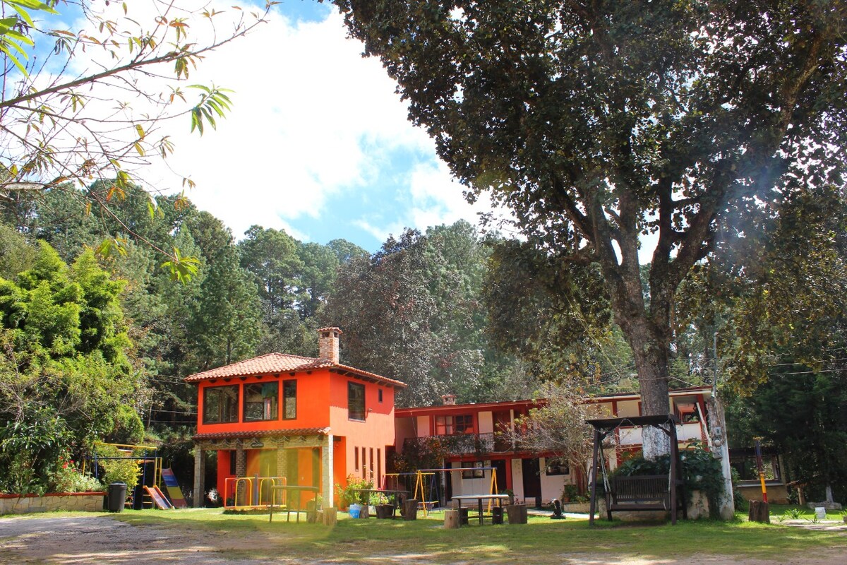 Relax with the whole family at this peaceful place to stay. Peaceful cabin on the mountains of San Cristobal de las Casas. Enjoy your rustic cottage surrounded by nature. Two terraces one with a fire pit. One large room with a king size bed and two tween beds and a pull out sofa. One small bathroom. Full kitchen.