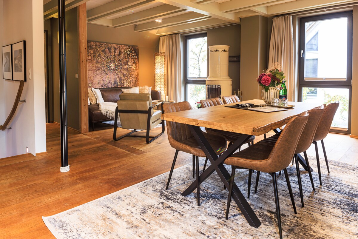 ... look out of your bed onto the water, enjoy the peace and quiet and listen to the rustle of the beech forest, experience bike tours directly on the water and enjoy nature. A beautiful, modern and rustic, low-energy half-timbered house with thatched roof, Moroccan tiles, oak floorboards and clay plaster walls awaits you. For activities there is a beautiful large garden with a forest swing, free steam sauna, outdoor shower and tub, a standup paddle, a paddle boat and 4 bicycles.