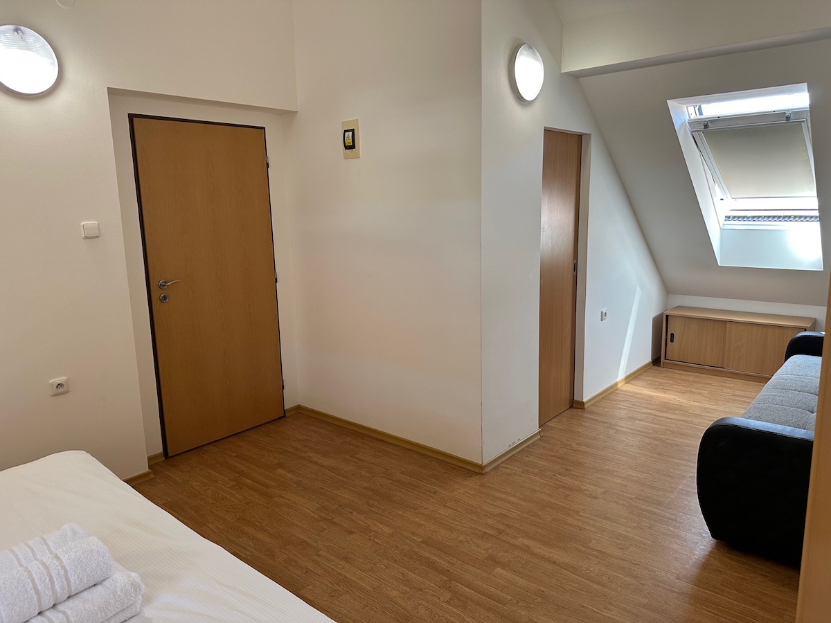 Welcome to our Modern apartment in Znojmo. From the 6th floor, you'll enjoy a beautiful view of the city. 52m² apartment has two rooms: living room with TV, desk, and pull-out sofa (190x120), and separate bedroom with bed (200x180). Kitchen is equipped with built-in appliances, cookware, bar, and coffee machine. There's bathroom with shower and separate WC. Bedroom is air-conditioned, and living room has ventilation. Trip tips: Znojmo's historic center, Vranov nad Dyjí, NP Thaya.