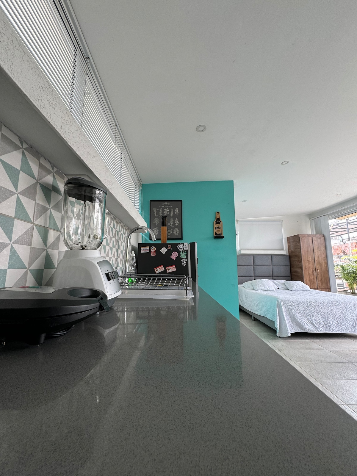 Disfruta una estancia inolvidable en este apartamento elegante y tranquilo, ideal para estadías cortas o largas. Cada detalle ofrece confort y limpieza impecable. Relájate en una habitación tipo hotel cinco estrellas con cama Queen, TV LG, cortinas black out y aire acondicionad potente. La cocina moderna está equipada con electrodomésticos nuevos y utensilios para que te sientas como en casa donde puedas disfrutar desde un delicioso café o una cena inolvidable.