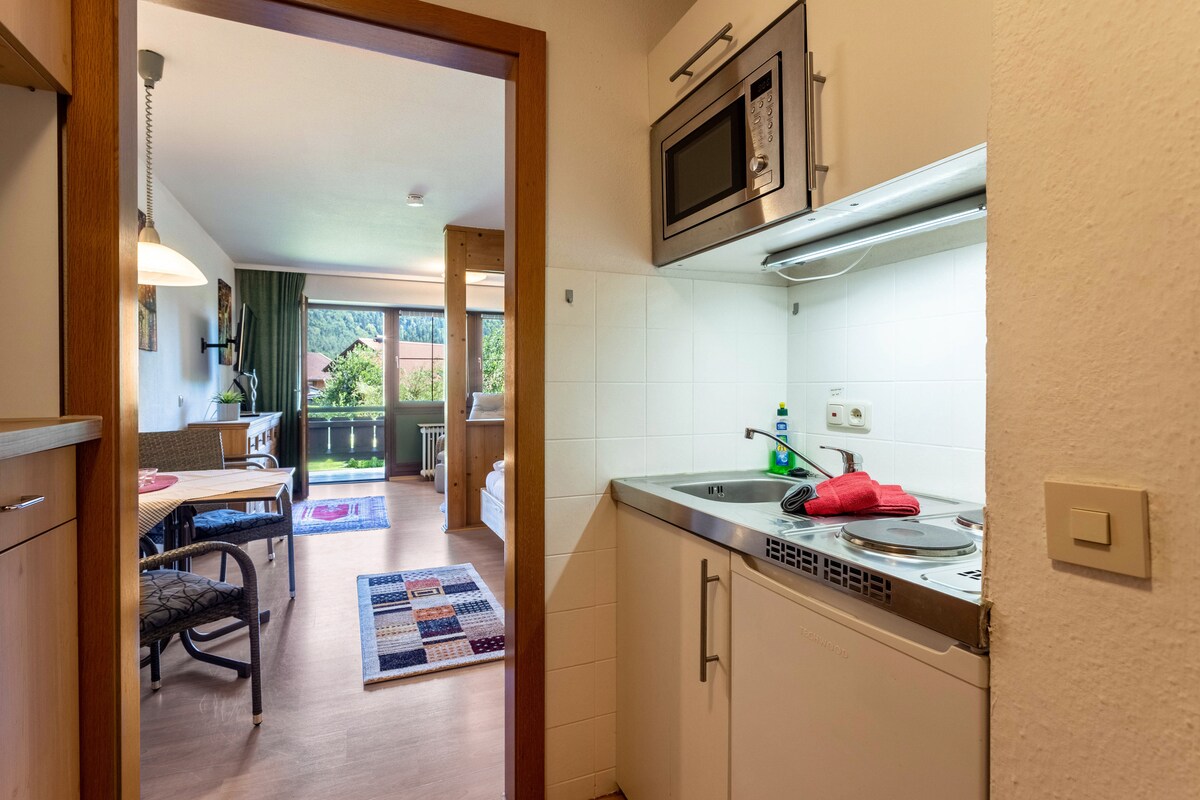 The studio apartment Bergblick is located in Inzell. The apartment is located on the second floor of the 'Ferienpark ALPINA' of Inzell and offers a beautiful view of the nearby mountains and a beautiful garden area. It is located only 5 minutes walk from the center of the village in a quiet area. The 35 m² property consists of a living room, a well-equipped kitchen, 1 bedroom, and 1 bathroom and can therefore accommodate 2 people.